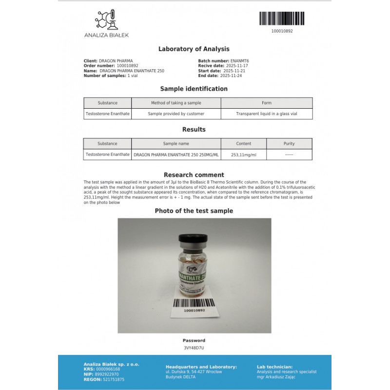 Last Lab Test: Nov 2025Substance: Testosterone EnanthateManufacturer: Dragon Pharma