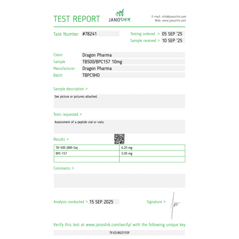 Manufacturer: Dragon Pharma Substance: Pentadecapeptide BPC 157 5mg , Thymosin beta 4 5mgPackage: 2ml vial (powder form)
