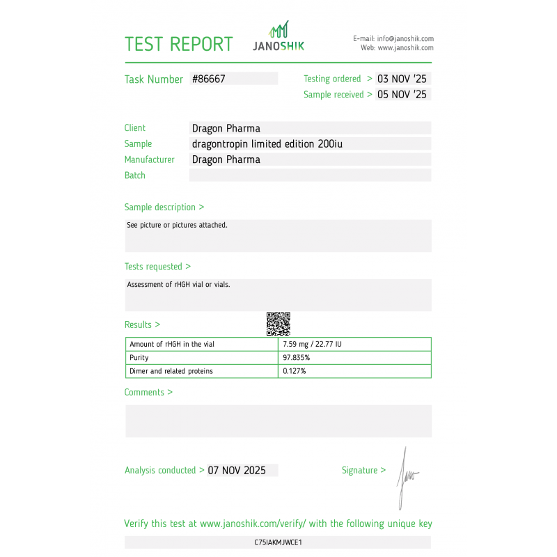 Manufacturer: Dragon Pharma Substance: Human Growth HormonePackage: 10 vials x 20 IU / 200 IU
