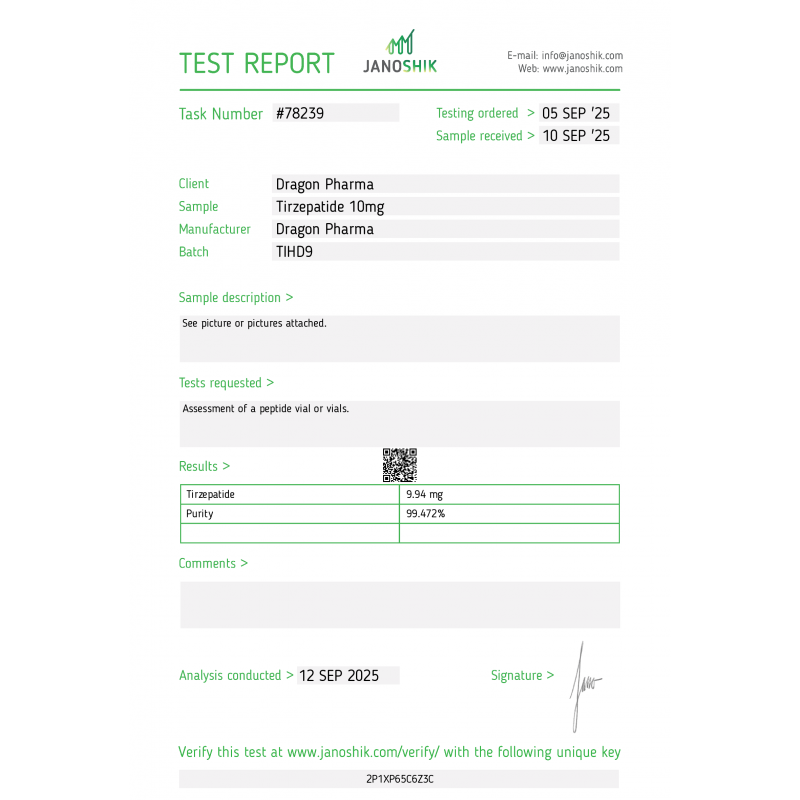 Manufacturer: Dragon Pharma Substance: TirzepatidePackage: 1 vial (10 mg) (powder form)
